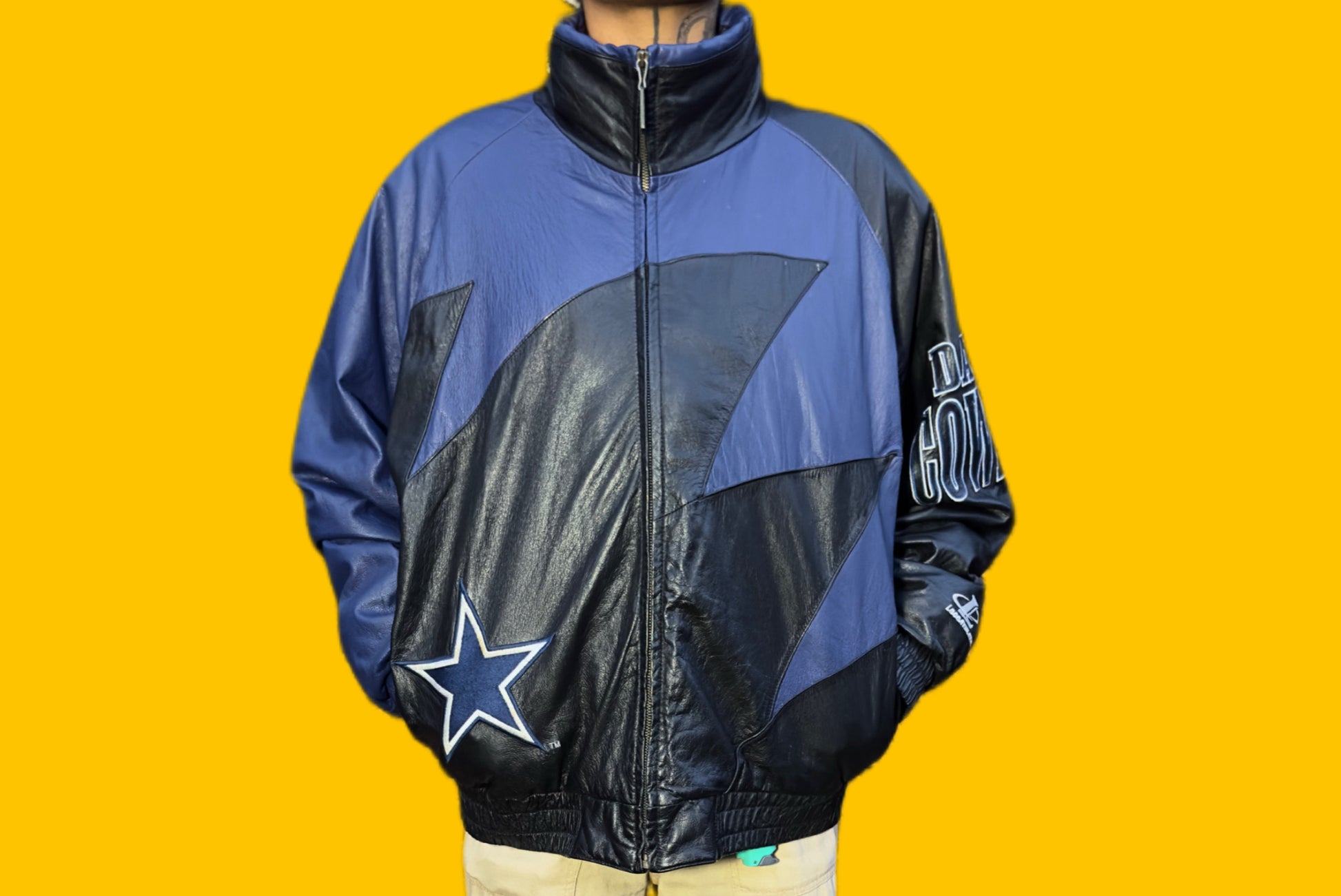 Details: Genuine leather outer shell with bold black and navy color blocking. Classic Cowboys star patch on front and “COWBOYS” embroidered across the back. Full zip front with elastic cuffs and waistband. Tag shows Logo Athletic – Classic Team Collection (NFL). Lining is nylon with polyester fill. Professional leather clean only. Minor natural wrinkling from age, no major flaws visible.