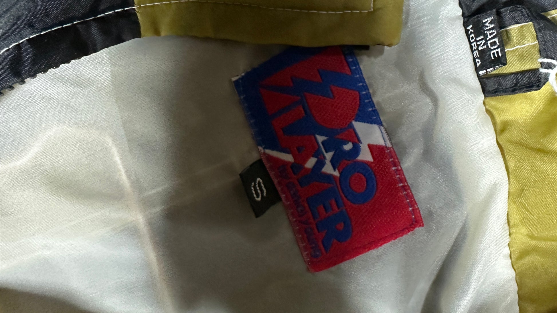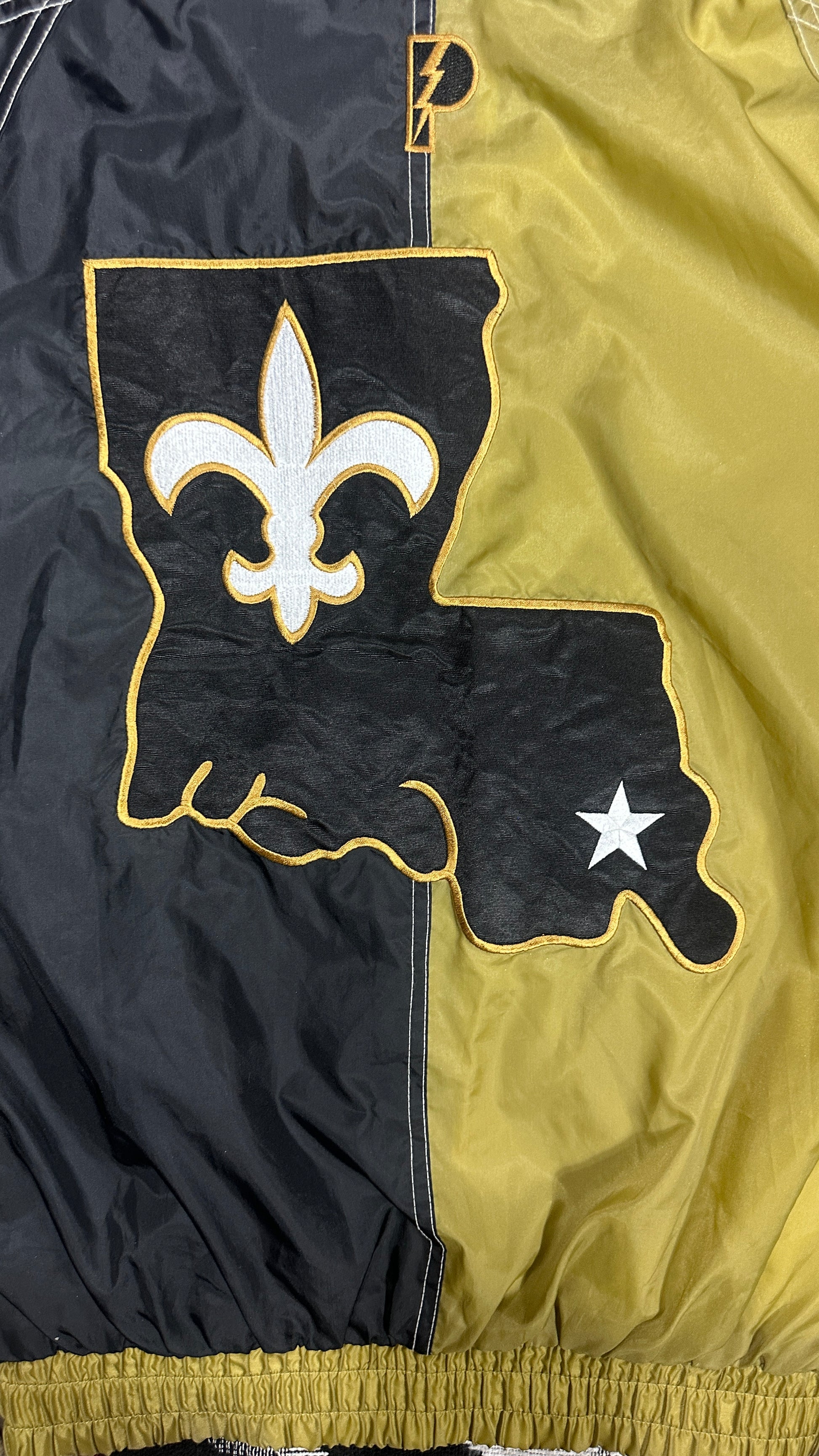 Authentic vintage Pro Player windbreaker featuring bold black-and-gold split color blocking with white accent panels. Oversized Saints logo across the back in the shape of Louisiana with fleur-de-lis embroidery and a star at New Orleans. Matching front logo patch, embroidered “SAINTS” on collar, and classic ’90s puffed silhouette. Fully lined with inside tag intact. A true collectible piece for Saints fans and vintage sportswear lovers.