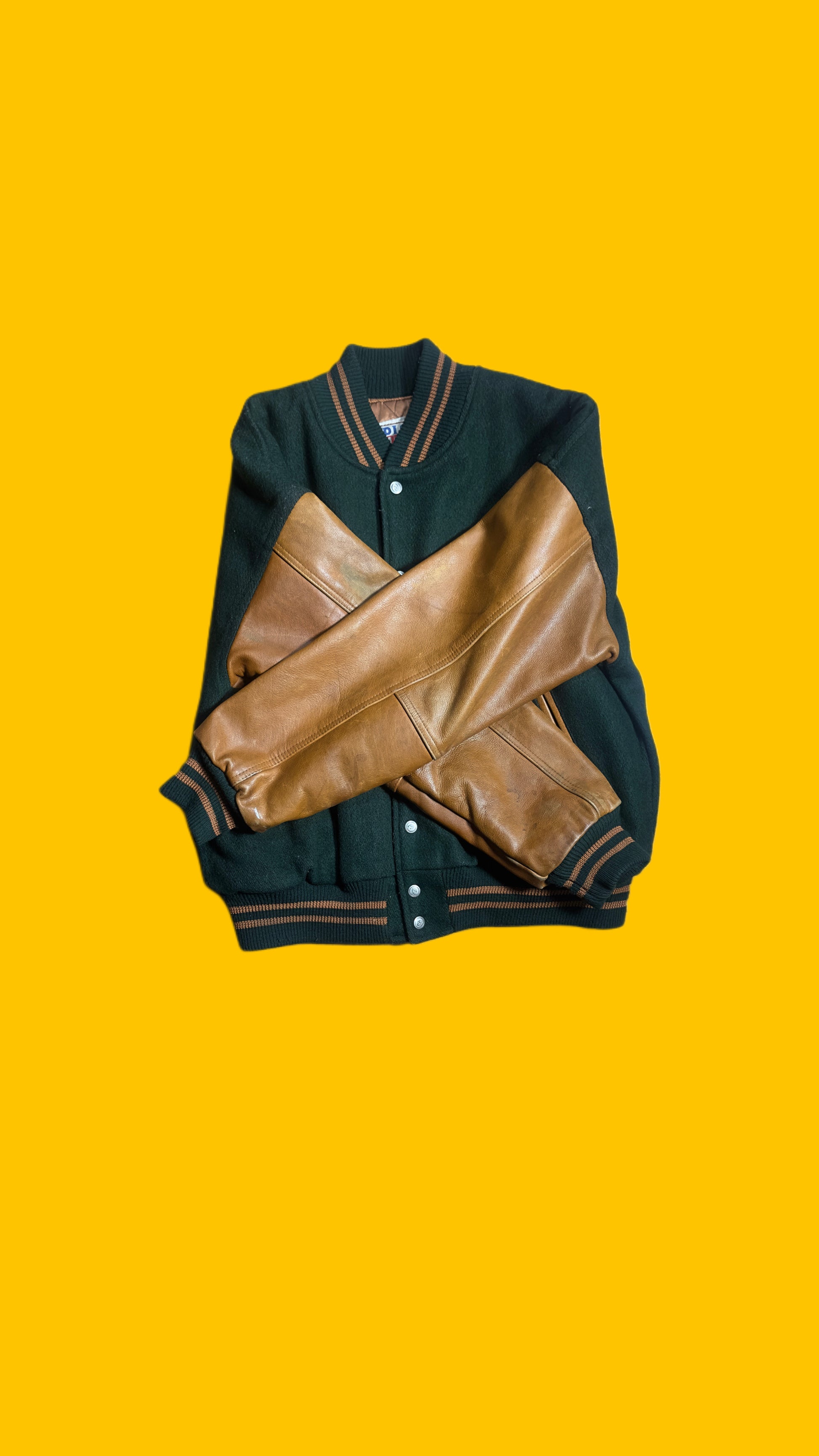 Dark forest green wool body with brown leather sleeves. Features embroidered Walt Disney Studio graphic on the back with Mickey Mouse artwork. Front has matching Mickey patch over the chest. Quilted satin interior lining. Classic snap button closure and striped ribbed cuffs, collar, and waistband. Made in USA – authentic vintage piece.